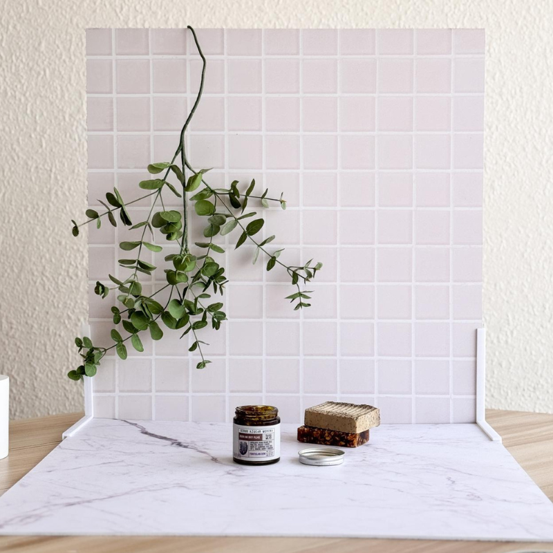 Usa 2 fondos y los soportes en L para armar tu estudio. Intercambia base y pared y experimenta con diferentes looks. (Recuerda agregarlos a tu carrito.)
